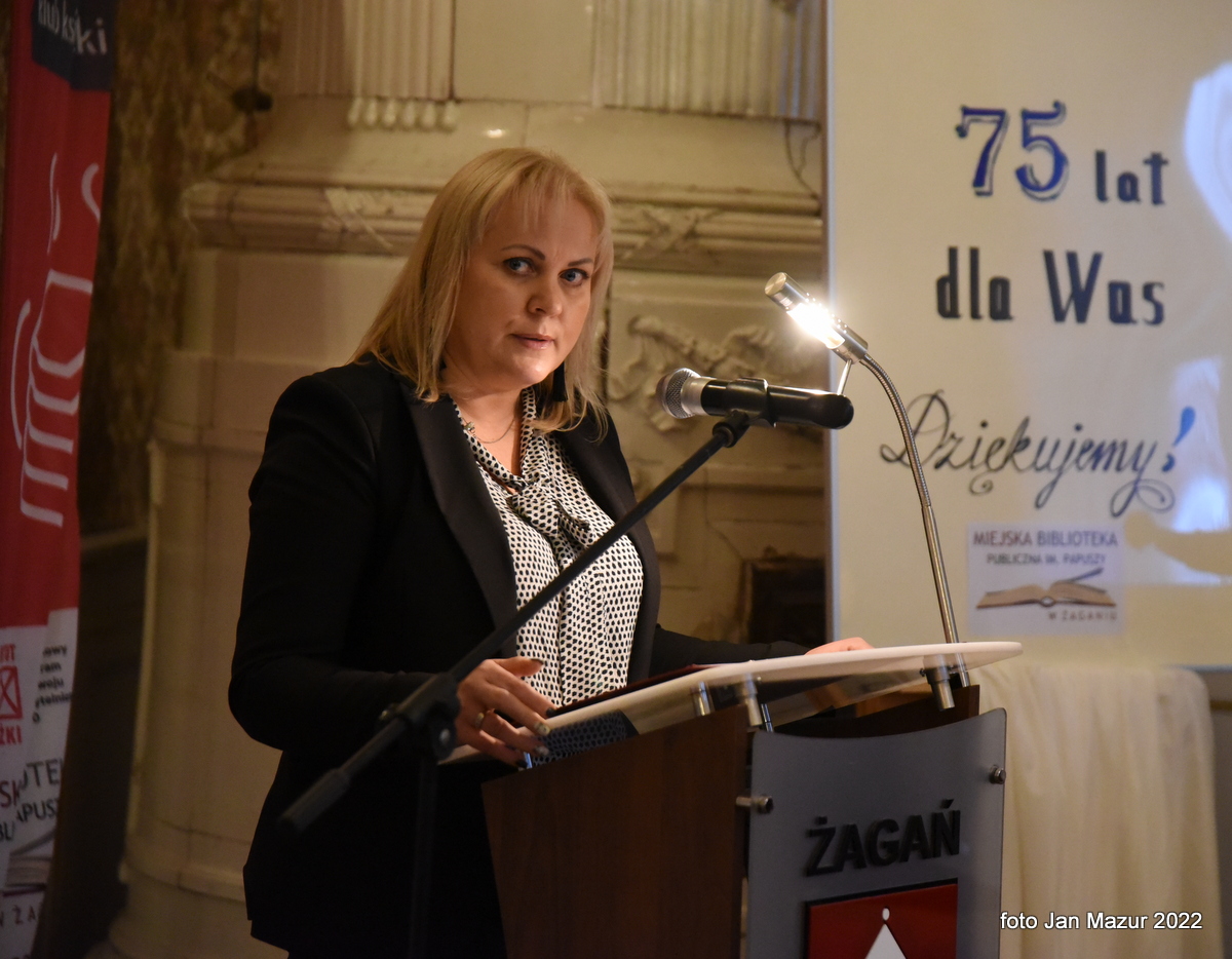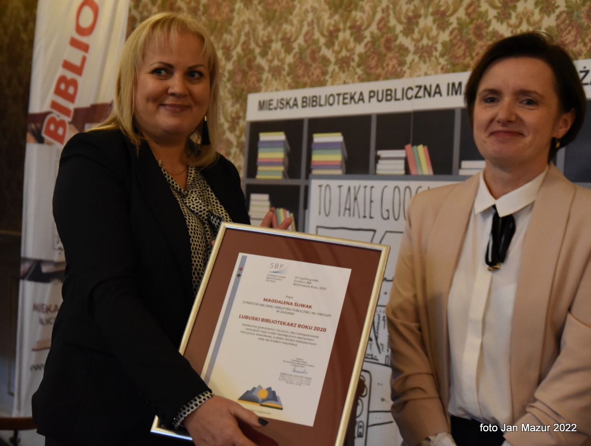 W trakcie uroczystości dyrektor Magdalena Śliwak odebrała dyplom potwierdzający zdobyty przez nią tytuł Lubuskiego Bibliotekarza Roku 2020, który wręczyła jej Anna Polus, dyrektor Wojewódzkiej i Miejskiej Biblioteki Publicznej im. Norwida w Zielonej Górze. Pani dyrektor życzyła żagańskiej placówce nieustającego zainteresowania i wsparcia władz miasta prowadzoną przez nią działalnością.