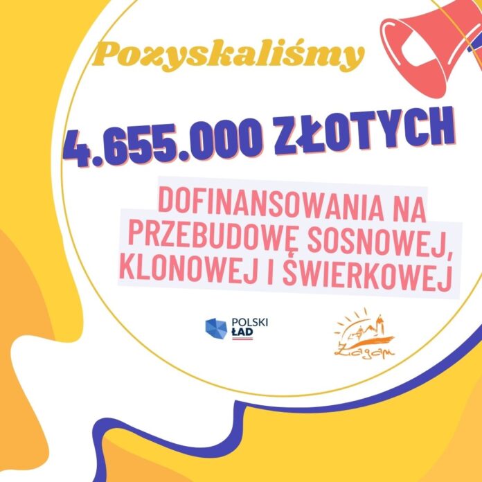 28  stycznia 2023 roku otrzymaliśmy promesę na dofinansowanie zadania Przebudowy ulicy Sosnowej, Klonowej i Świerkowej w Żaganiu z Rządowego Funduszu Polski Ład: Programu Inwestycji Strategicznych. Gmina Żagań o statusie miejskim otrzymała potwierdzenie przyznania dofinansowania inwestycji do kwoty 4.655.000 złotych. Od tego momentu samorząd ma 9 miesięcy na przeprowadzenie procedury przetargowej.