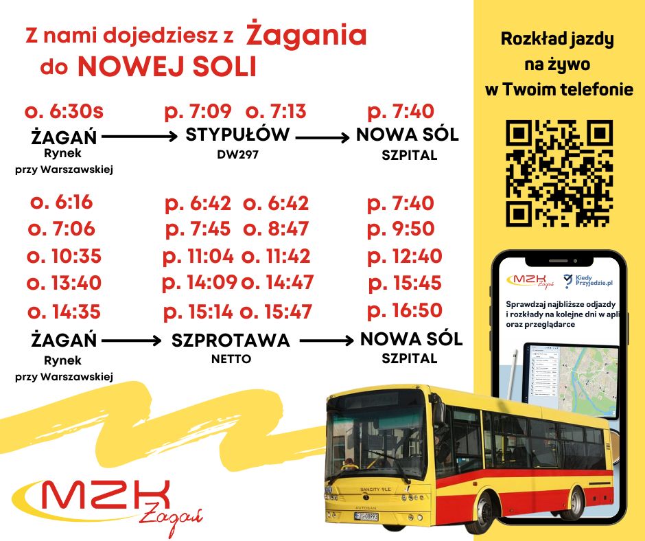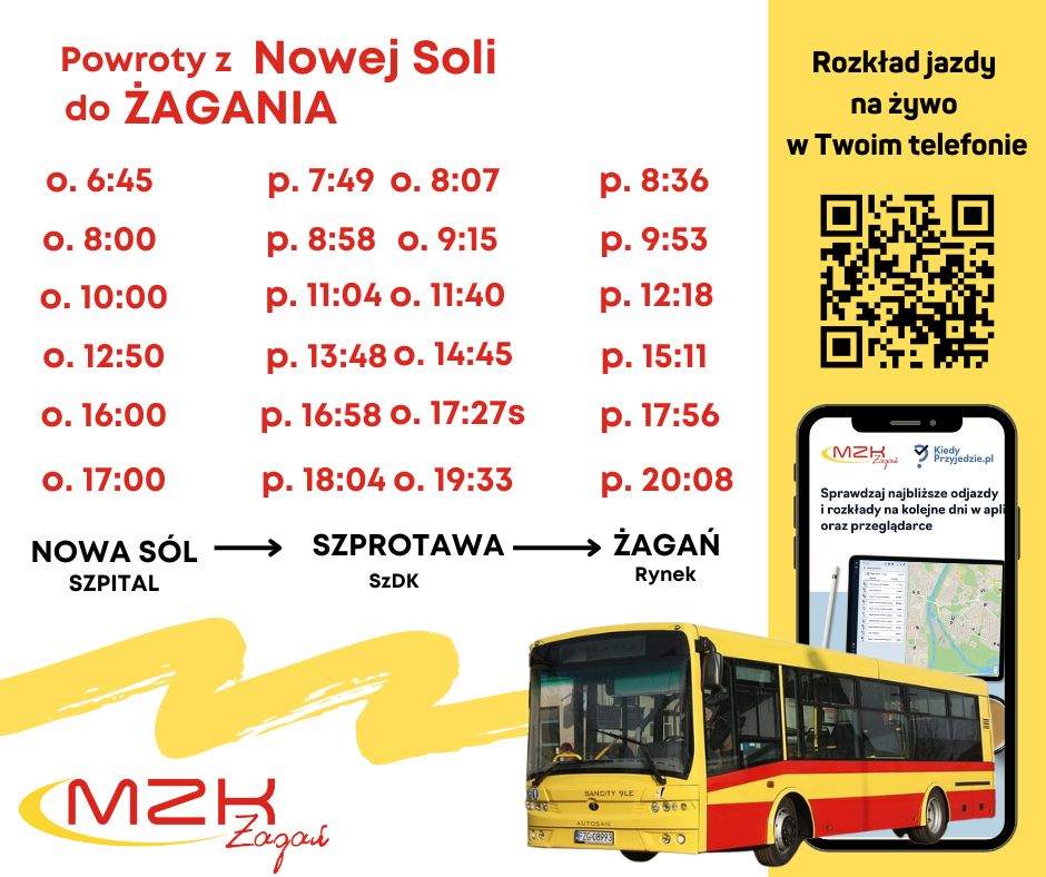 W odpowiedzi na zapytanie radnego Piotra Łosia dotyczące połączeń autobusowych z Żagania do Nowej Soli, miejski przewoźnik opublikował wykaz obsługiwanych połączeń. Osoby wybierające się z Żagania do szpitala w Nowej Soli mogą korzystać z następujących połączeń: