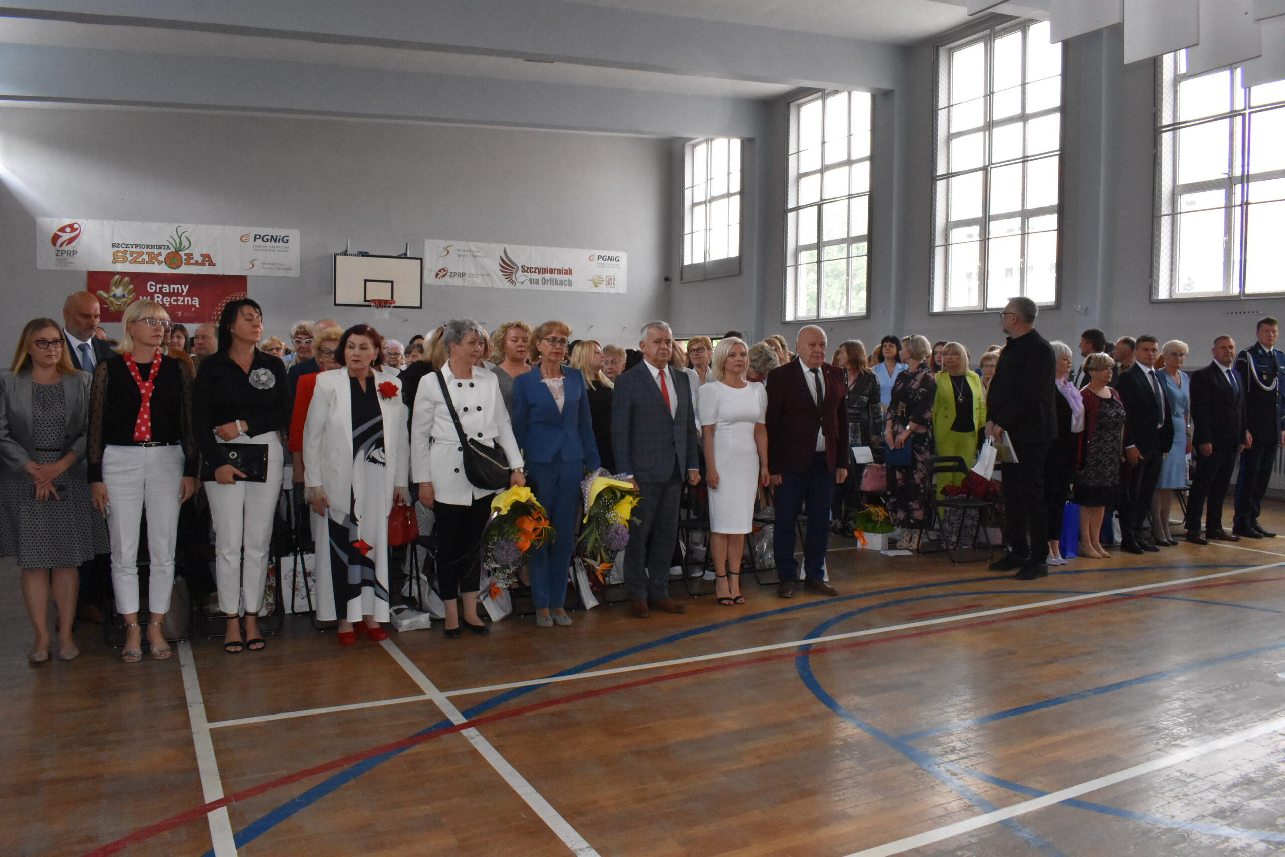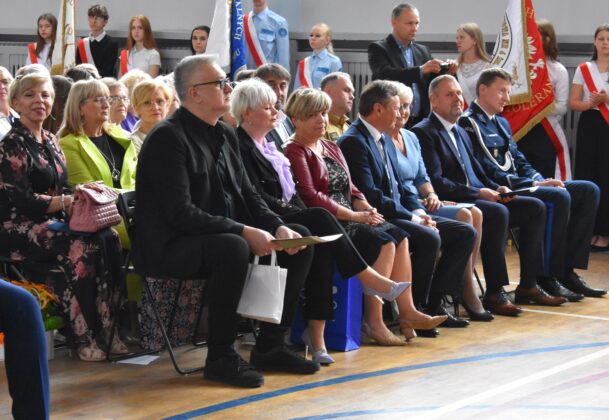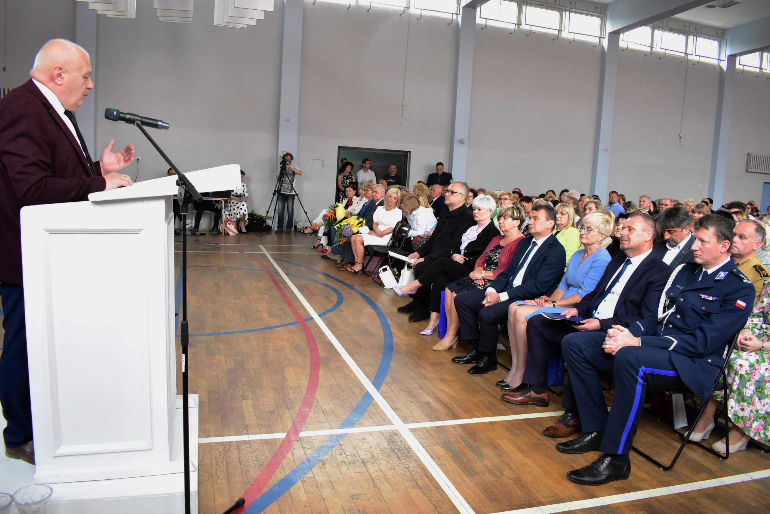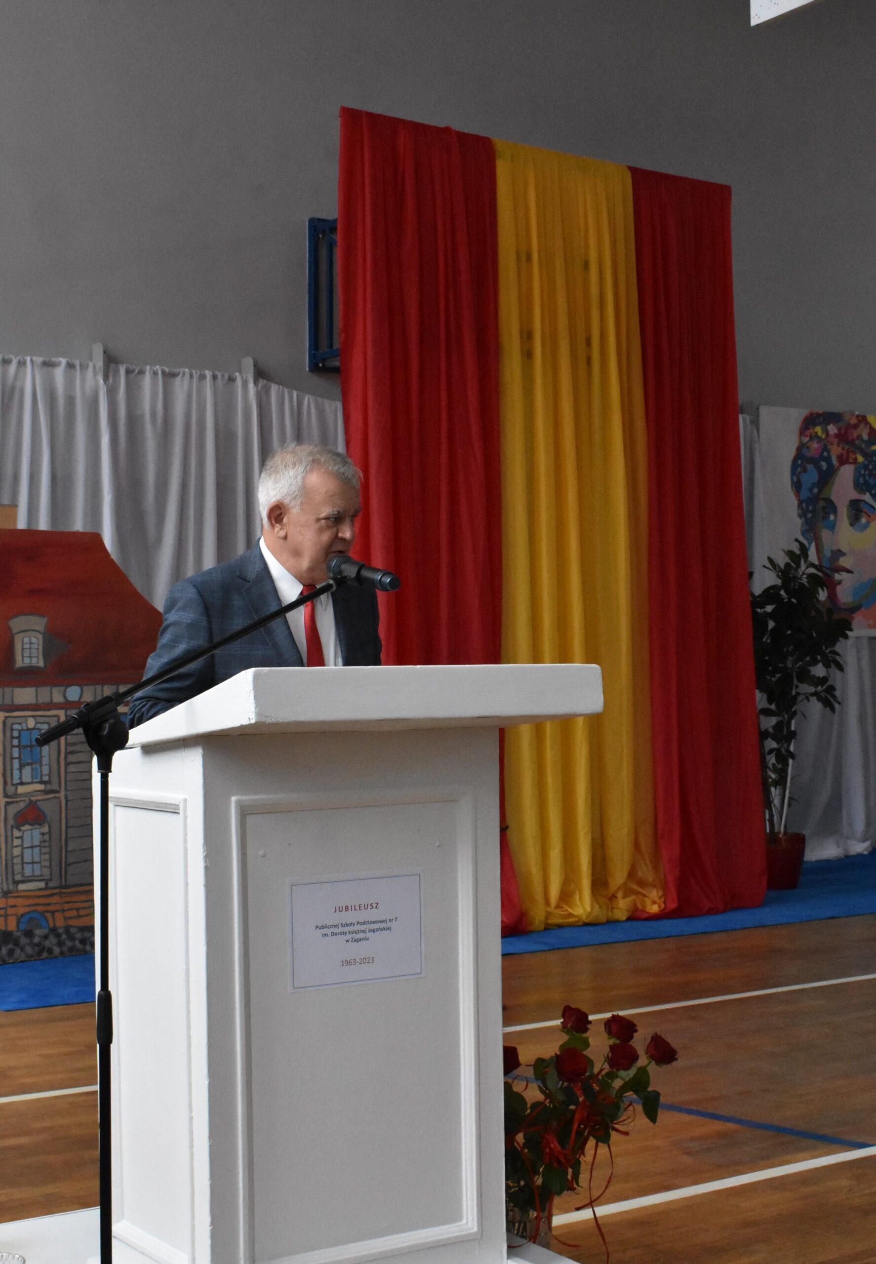 Andrzej Katarzyniec zabrał głos jako gospodarz miasta i absolwent “Siódemki”. Wspominał zabawne sytuacje towarzyszące nauce szkolnej, młodzieńcze wybryki, wybitnych nauczycieli, dzięki którym szkoła pozostaje w pamięci wszystkich absolwentów placówki. Burmistrz przypomniał, że obowiązkiem samorządu jest troska o mienie szkół, czego doskonałym przykładem są prace wykonane w budynku w ostatnim czasie – remont sali gimnastycznej i dachów. Gospodarz miasta podziękował nauczycielom za wysiłek, jaki wnoszą oni w rozwój najmłodszych członków naszej małej ojczyzny.