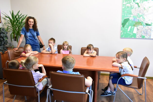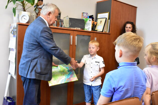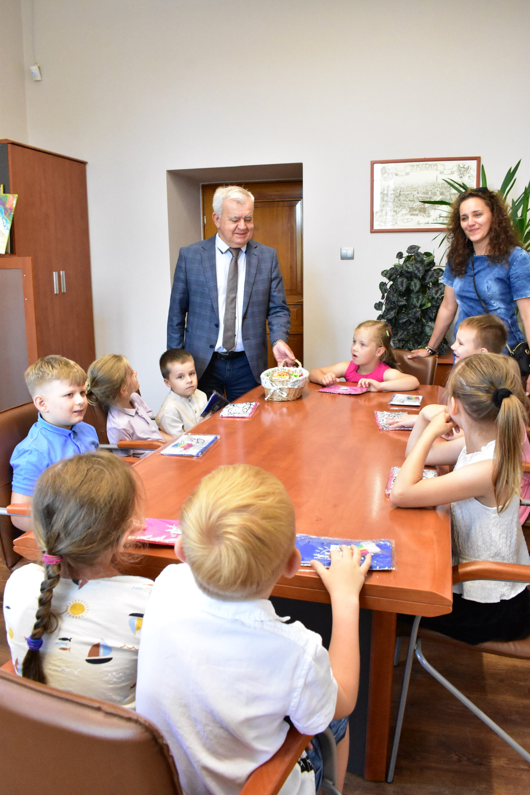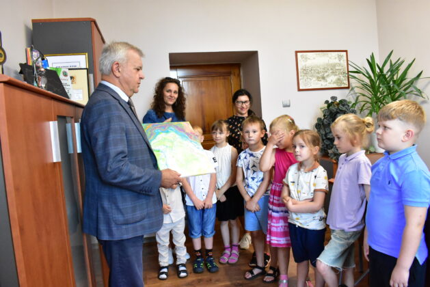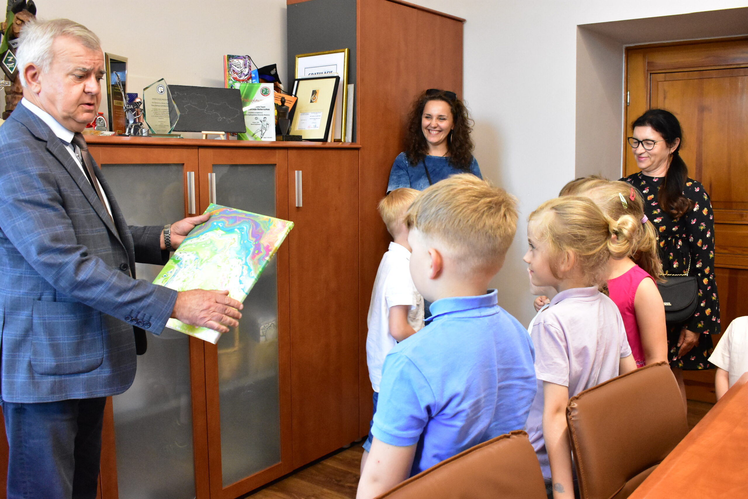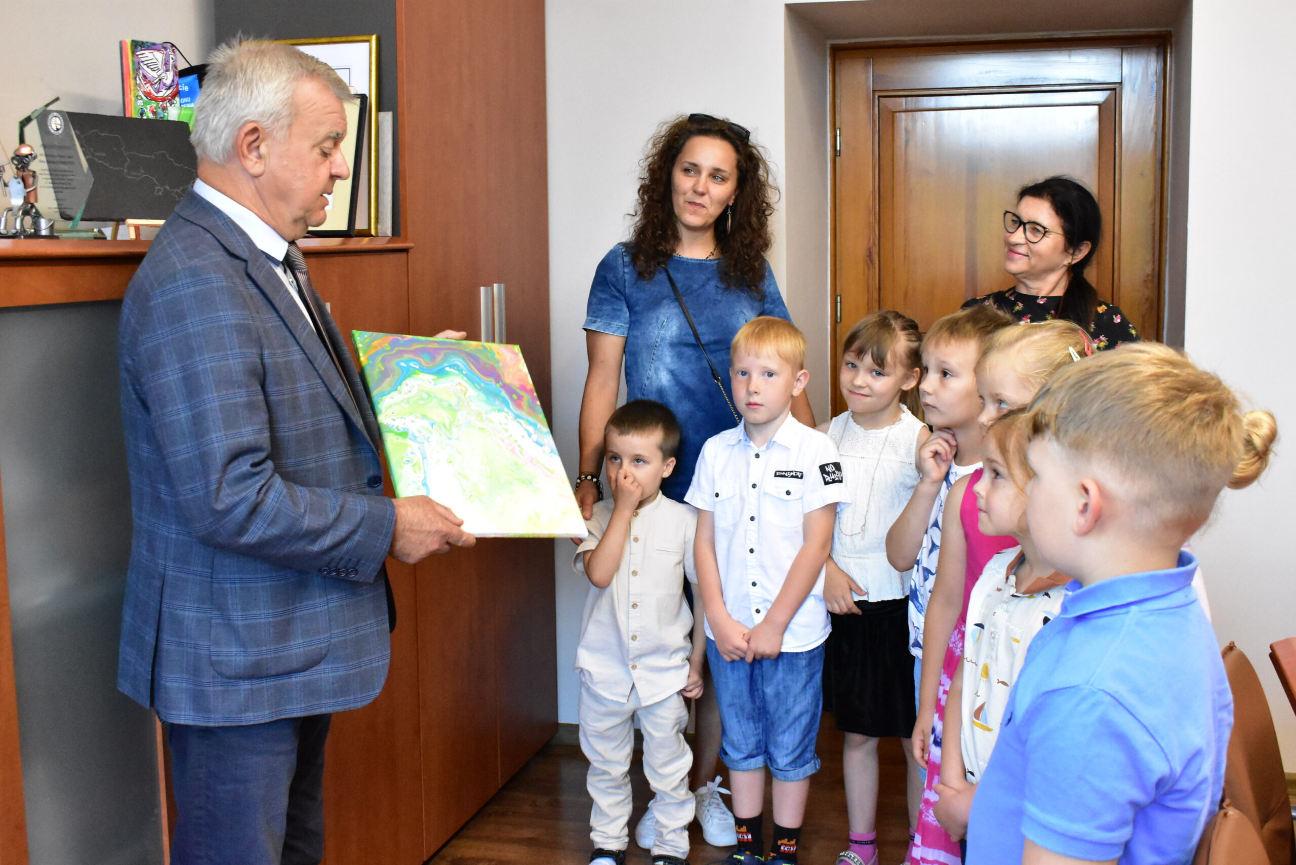 Do magistratu przyszły dziś dzieci z grupy 6-latków Niepublicznego Przedszkola Zielony Zakątek, aby podziękować burmistrzowi Andrzejowi Katarzyńcowi za zaangażowanie w opiekę nad najmłodszymi mieszkańcami miasta i przekazać wyjątkowy obraz namalowany przez dzieci. Na odwrocie pracy znalazła się specjalna dedykacja, w której pracownicy wraz z dyrektor Małgorzatą Zdanowicz życzy gospodarzowi miasta “niegasnącego zapału oraz pomyślnej realizacji wielu pomysłów”.