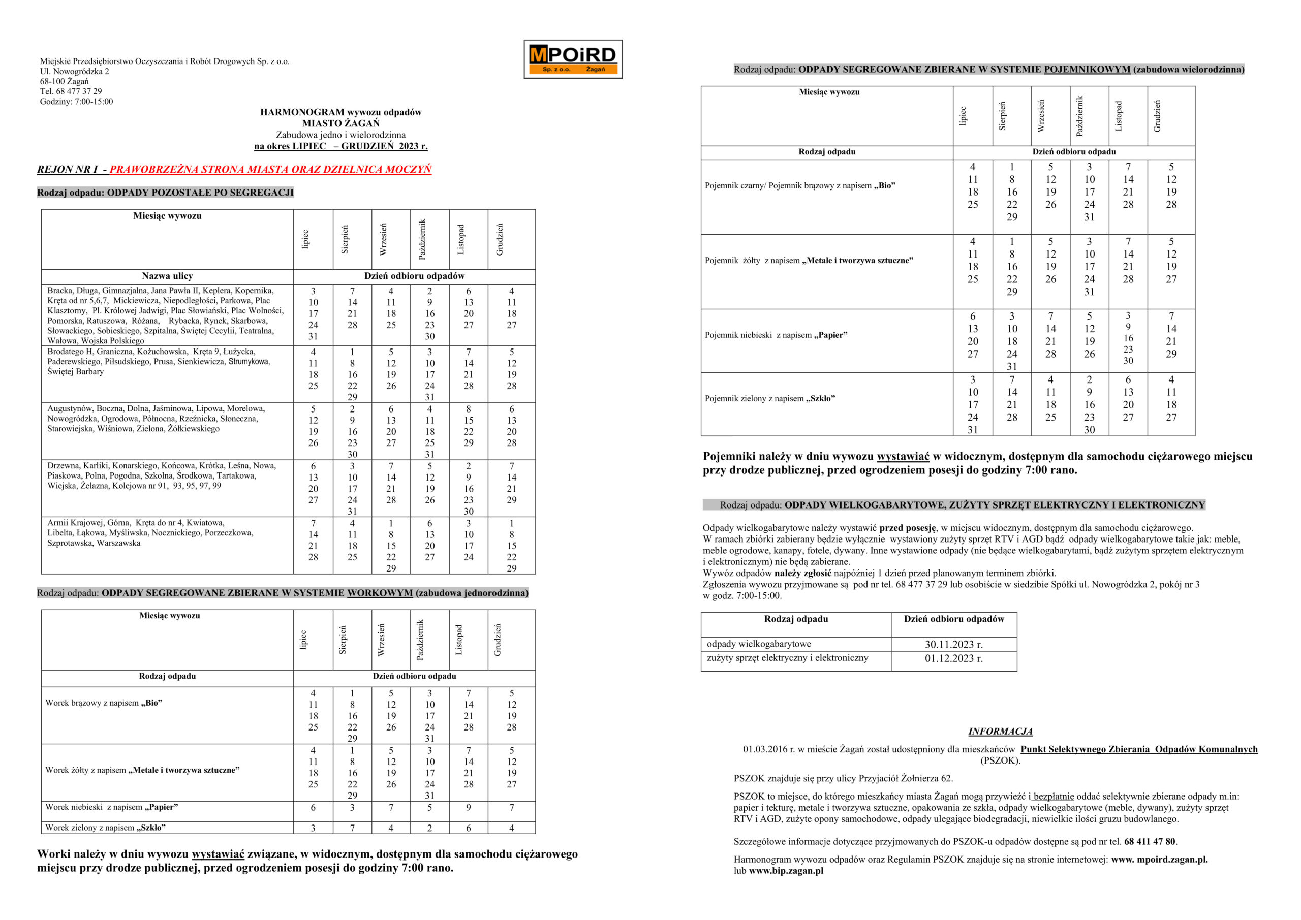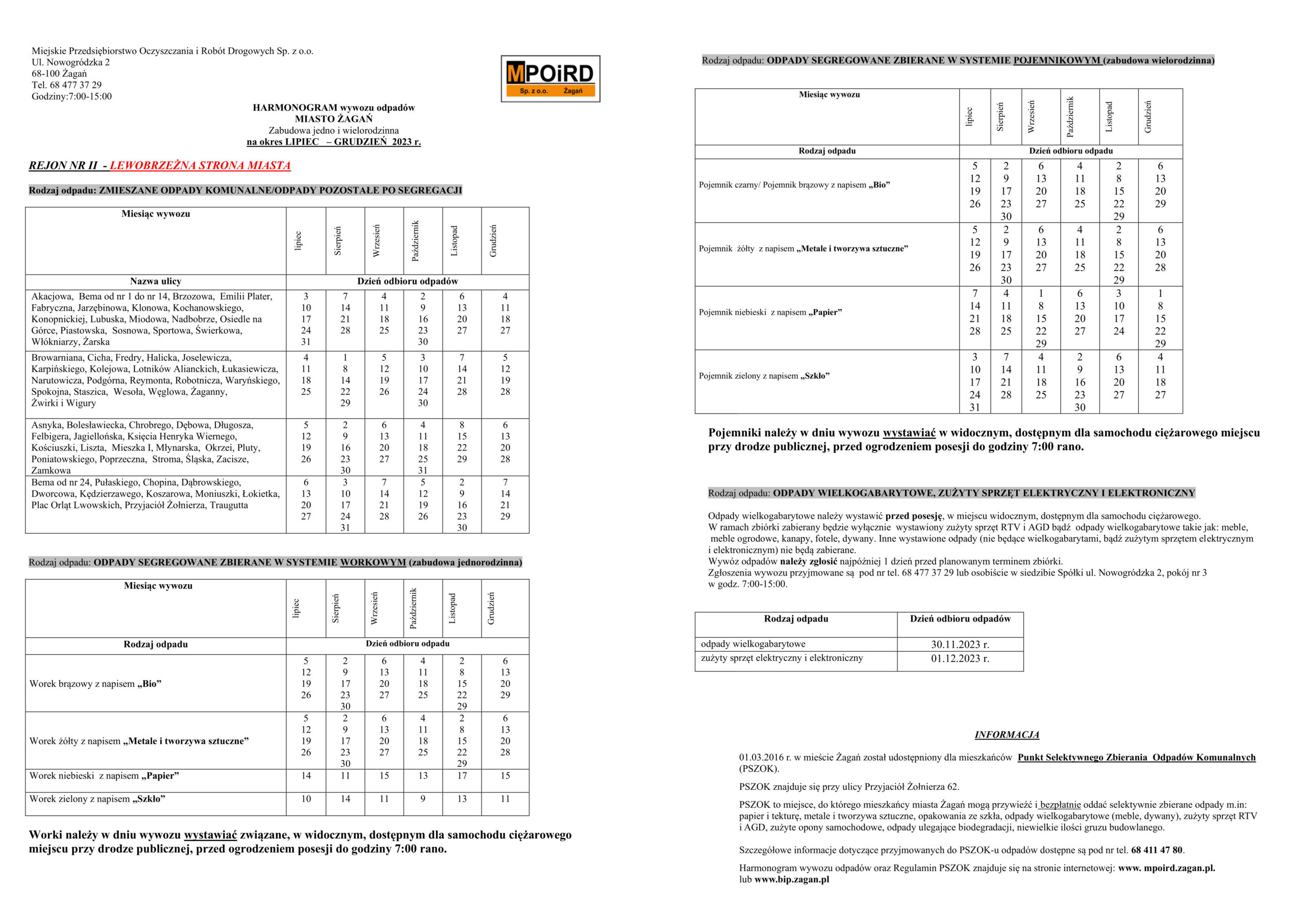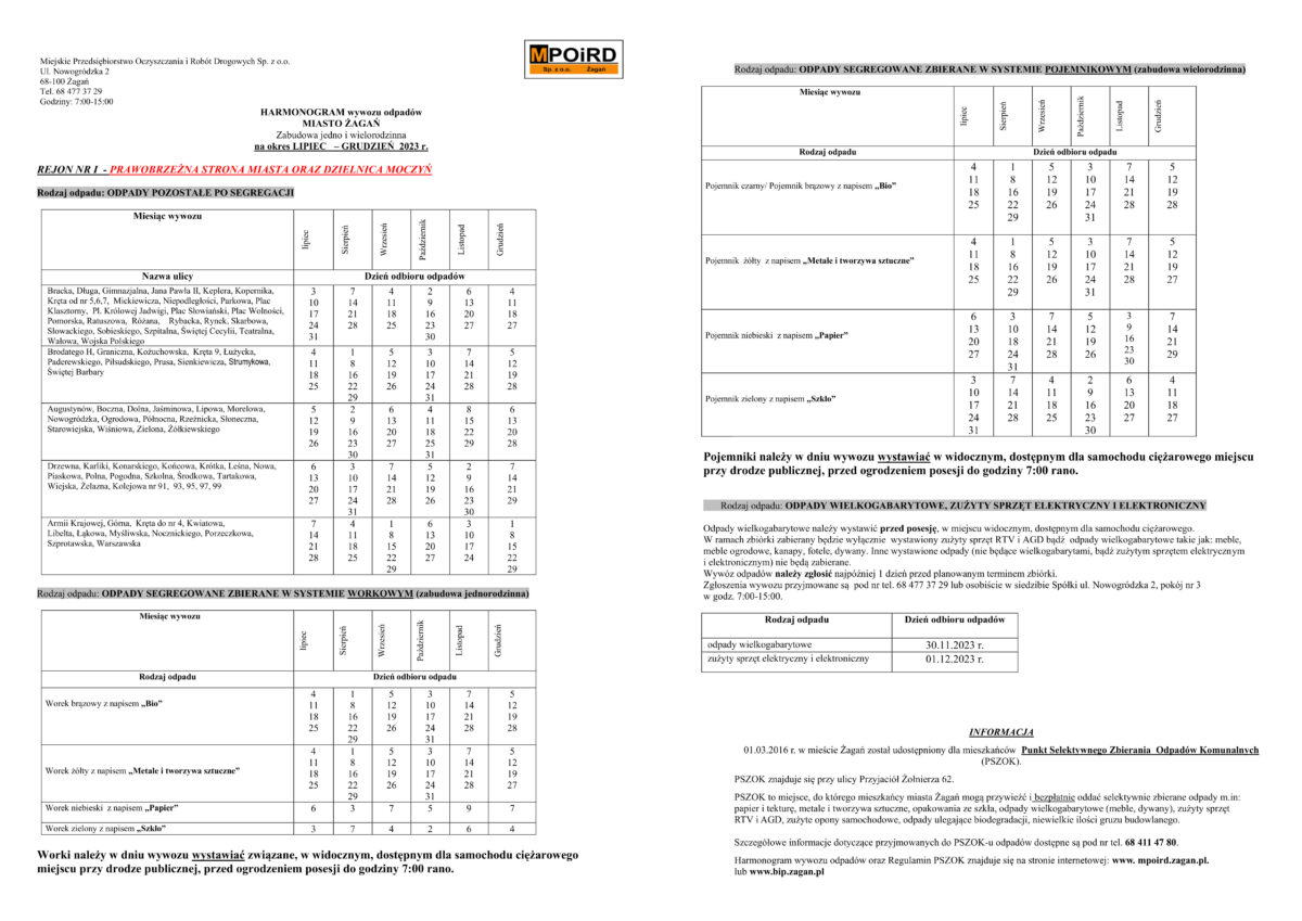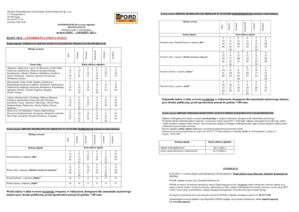 Od 1 lipca do końca grudnia 2023 roku obowiązuje nowy harmonogram odbioru odpadów w systemie workowym, pojemnikowym, elektroniki, sprzętu AGD oraz odpadów wielkogabarytowych z terenu Żagania.