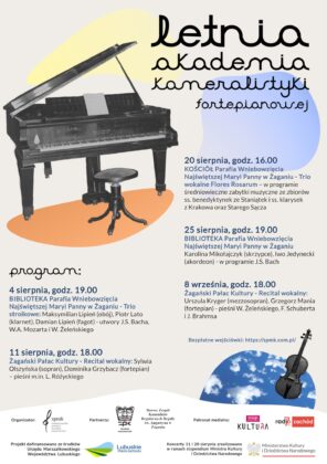 Najbliższy weekend rozpoczniemy spacerem tematycznym z przewodnikiem po mieście. Start już dziś o godz. 18.00 przy Centrum Informacji Turystycznej w Żaganiu (ul. Szprotawska 4). Tematem przewodnim spaceru będzie Albrecht von Wallenstein, który zapoczątkował budowę żagańskiego pałacu. Poznamy obiekty związane z jego działalnością oraz historię lokalnego drukarstwa. Spacer poprowadzi Halina Dobrakowska – prezes Towarzystwa Przyjaciół Żagania, regionalistka, pilot wycieczek, przewodnik turystyczny po Żaganiu, Dolnym Śląsku i Sudetach. Zwiedzanie zakończymy przy poaugustiańskim zespole klasztornym, w którym o godz. 19.00 rozpoczną się koncerty w ramach Letniej Akademii Kameralistyki Fortepianowej. Utwory Bacha, Mozarta i Żeleńskiego zagra w klasztornej bibliotece Trio stroikowe: Maksymilian Lipień (obój), Piotr Lato (klarnet), Damian Lipień (fagot).