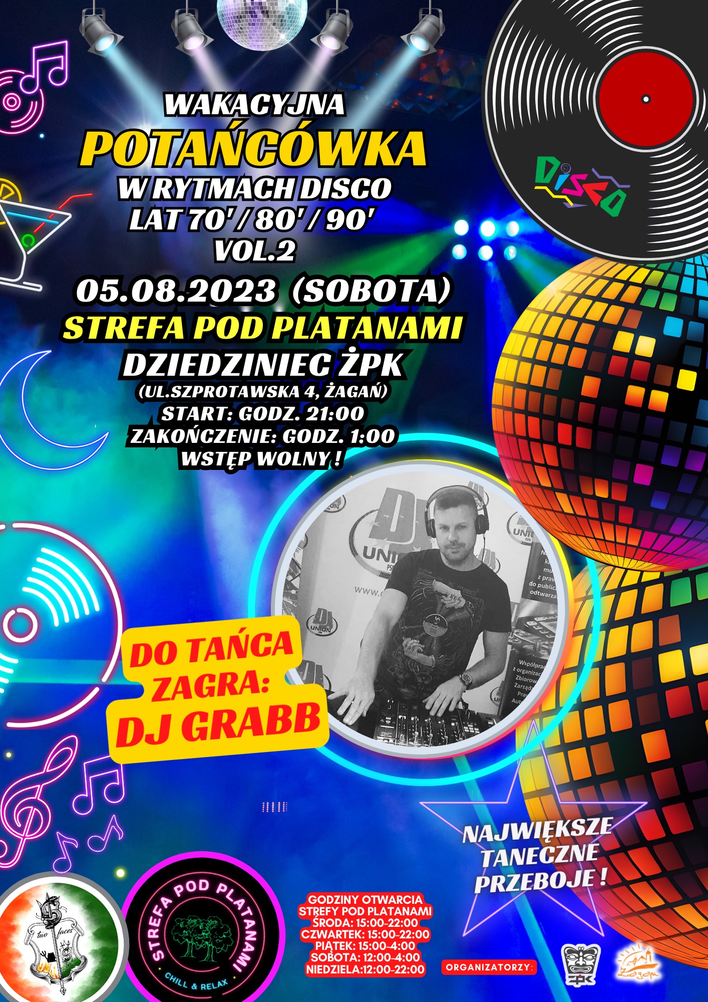 Od 21.00 zapraszamy na dziedziniec pałacu na wakacyjną potańcówkę w rytmie disco lat 70., 80. i 90., na której zagra DJ GRAAB.