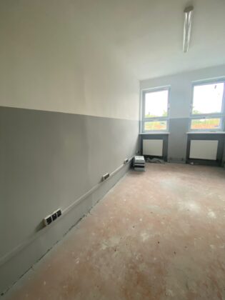 Wymieniono już okna i drzwi, wykonano izolację termiczną ścian fundamentowych i cokołowych oraz izolację termiczną stropodachu. Trwają prace instalacyjne, montowana jest armatura w kotłowni, prowadzone są roboty dachowe, prace zewnętrzne związane z zagospodarowaniem terenu oraz wykończeniowe wewnątrz budynku