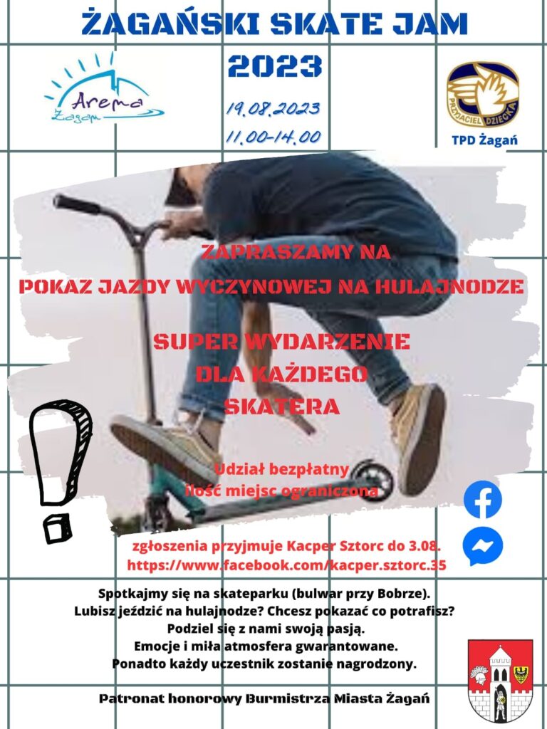 W sobotę od godz. 11.00 w skateparku przy bulwarze nad Bobrem będzie można zobaczyć pokaz jazdy wyczynowej na hulajnodze w ramach wydarzenia „Żagański Skate Jam”.