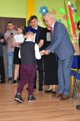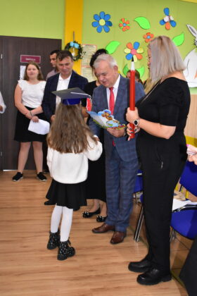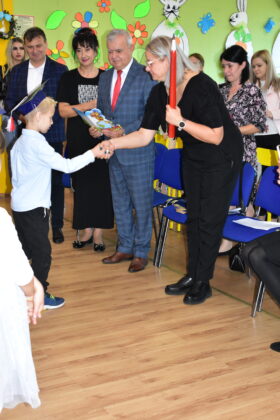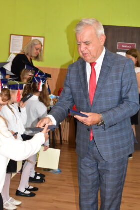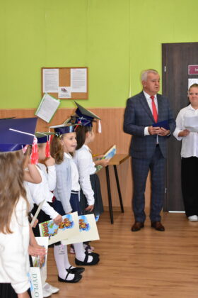 Na zakończenie uroczystości burmistrz Andrzej Katarzyniec podziękował wychowawczyni za doskonale przygotowany program, dzieciom życząc wspaniałych chwil w murach żagańskiej “Czwórki”. Gospodarz miasta wręczył każdemu dziecku kartę podarunkową uprawniającą do korzystania z obiektów kompleksu Arena. Wartość otrzymanego przez każde dziecko bonu wynosi 100 złotych. Z obiektu sportowo-rekreacyjnego dzieci mogą korzystać wspólnie z rodzicami, dbając w ten sposób rodzinnie o kondycję fizyczną. Miasto zadbało o to, aby taką kartę otrzymały wszystkie dzieci rozpoczynające w tym roku naukę w miejskich placówkach. Naczelnik oświaty Mariusz Krugły przekazał dzieciom drobne upominki zakupione z tej okazji przez magistrat.