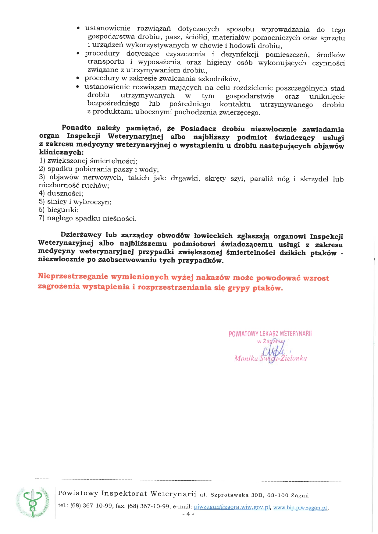 Powiatowy Lekarz Weterynarii w Żaganiu wydał komunikat do hodowców drobiu z powiatu żagańskiego następującej treści: