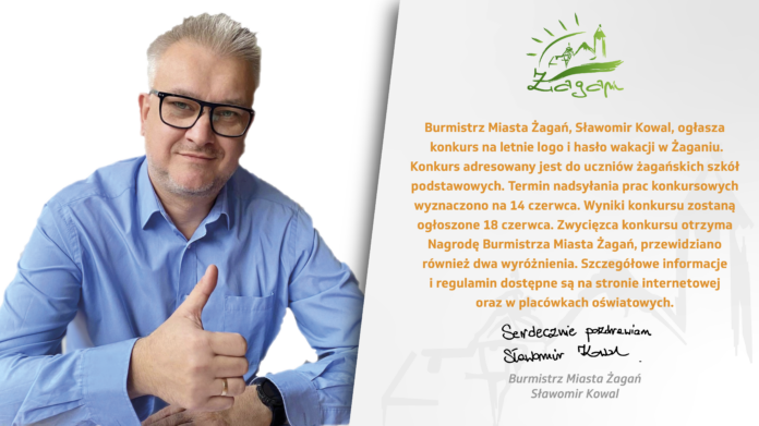 Burmistrz Miasta Żagań Sławomir Kowal ogłasza konkurs na letnie logo i hasło reklamujące tegoroczne wakacje w naszym mieście. W konkursie mogą wziąć udział wszyscy uczniowie publicznych szkół podstawowych z terenu Żagania. Projekt może być wykonany w formie tradycyjnej pracy plastycznej lub graficznej (komputerowej).