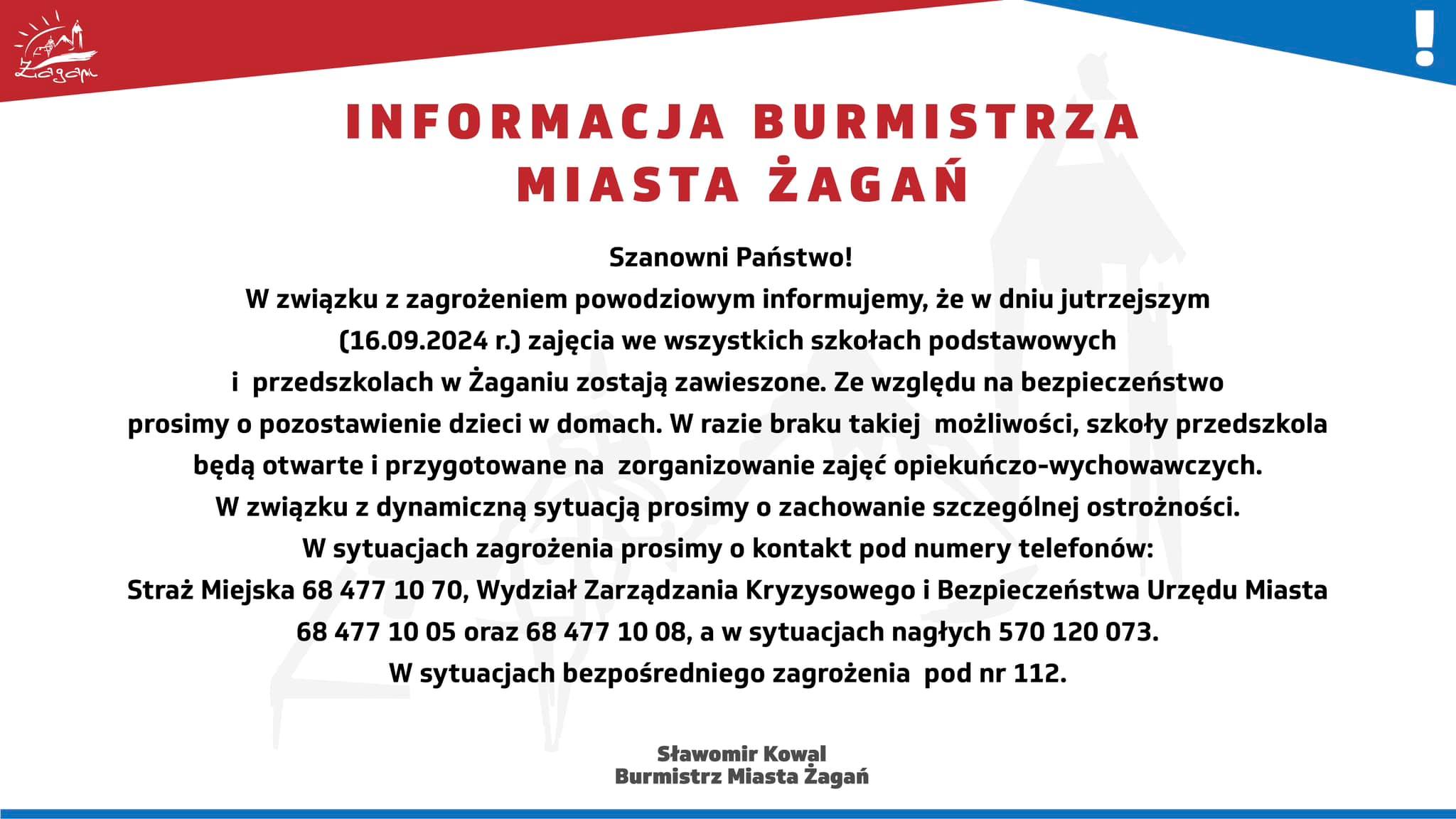 W związku z zagrożeniem powodziowym poniedziałkowe (16.09.2024) zajęcia w miejskich szkołach i przedszkolach w Żaganiu zostają zawieszone.