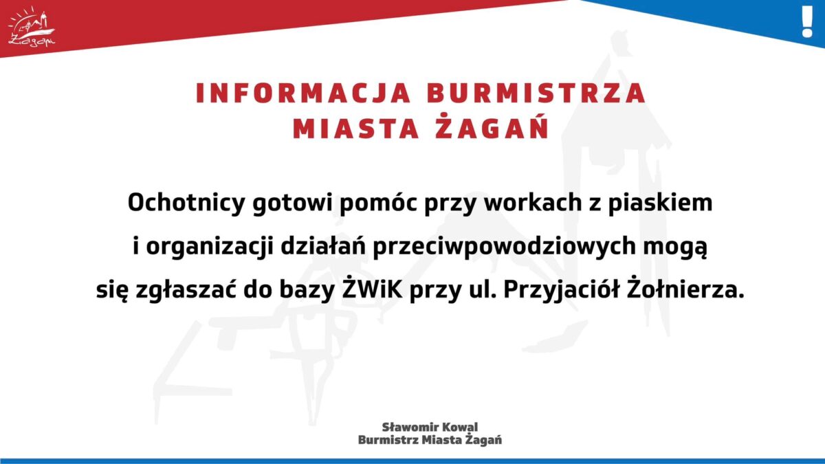 Jednocześnie w siedzibie Żagańskich Wodociągów i Kanalizacji przy ul. Przyjaciół Żołnierza rozpoczęliśmy wydawanie worków z piaskiem. Ochotnicy chcący wspomóc działania przeciwpowodziowe mogą zgłaszać się do ŻWiK.