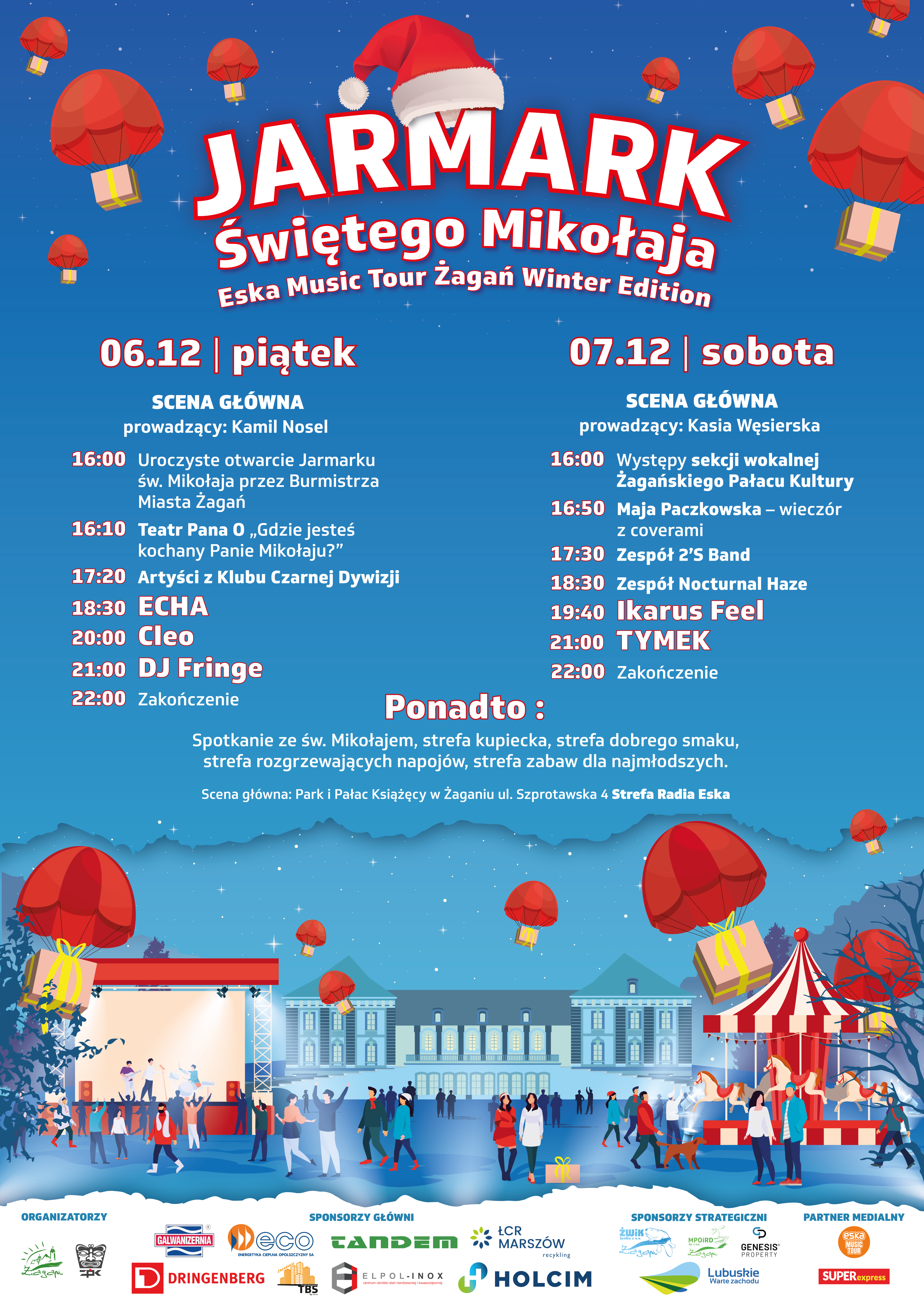 Ho, ho, ho! Drodzy Mieszkańcy, serdecznie zapraszamy na jedyny w naszym regionie Jarmark św. Mikołaja. Wspólnie spędźmy ten niezwykły przedświąteczny czas, bawmy się i dzielmy radością! W dniach 6 i 7 grudnia czekają na Was wspaniali artyści i moc atrakcji – liczne koncerty, spotkanie ze św. Mikołajem, strefa zabaw dla najmłodszych i strefa dobrego smaku. Wydarzenie jest częścią Eska Music Tour. Na mikołajowej scenie wystąpią Cleo, Ikarus Feel i Tymek. Imprezę poprowadzą dziennikarze radiowi Kamil Nosel i Kasia Węsierska.