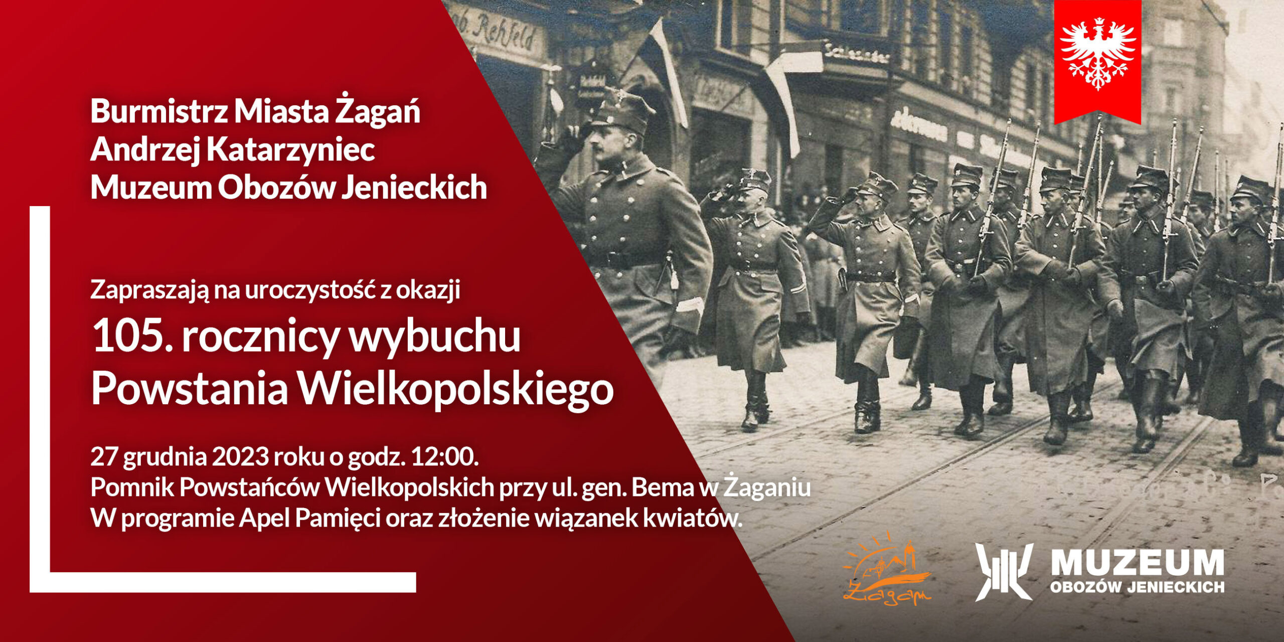 Burmistrz Miasta Żagań zaprasza na uroczystość z okazji 105. rocznicy wybuchu Powstania Wielkopolskiego, która odbędzie się 27 grudnia 2023 roku o godz. 12:00 przy Pomniku Powstańców Wielkopolskich przy ul. gen. Bema w Żaganiu.