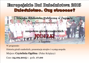 Biblioteka Miejska Publiczna zaprasza na spotkanie z góralami czadeckimi w ramach obchodów Europejskich Dni Dziedzictwa, które obchodzić będziemy 24 września 2015 r. o godzinie 17.00 w Czytelni Ogólnej (Pałac Książęcy). W programie spotkania z kulturą, tradycją i historią górali czadeckich znajduje się również występ zespołu JODEŁKI. Serdecznie zapraszamy!