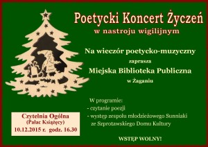 Zapraszamy na Poetycki Koncert Życzeń w nastroju wigilijnym. Koncert odbędzie się w Czytelni Ogólnej Miejskiej Biblioteki Publicznej w Żaganiu w czwartek 10 grudnia o godzinie 16:30. W programie czytanie poezji i występ zespołu młodzieżowego Sunniaki ze Szprotawskiego Domu Kultury.