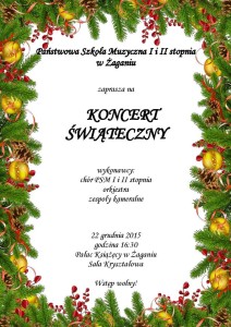 W imieniu Państwowej Szkoły Muzycznej I i II Stopnia w Żaganiu zapraszamy na Koncert Świąteczny, który odbędzie się 22 grudnia 2015 roku o godz. 16:30 w sali Kryształowej Pałacu Książęcego.Wstęp wolny.