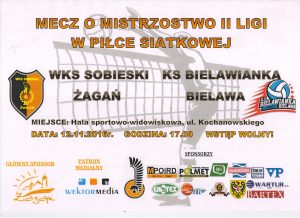 12 listopada 2016 roku o godzinie 17:00 zapraszamy na kolejny mecz naszych siatkarzy - drużyna WKS SOBIESKI ŻAGAŃ zmierzy się z drużyną KS BIELAWIANKA BESTER BIELAWA na naszej hali sportowej przy ulicy Kochanowskiego 6. Wstęp na mecz jest wolny.Zachęcamy do śledzenia wyników naszej drużyny na stronie Strefa Siatkówki