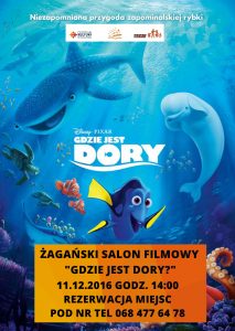 W najbliższą niedzielę 11.12.2016 zapraszamy wszystkie dzieci na seans (od 4 lat). W sali Inter o godz. 14:00 Pałacu Książęcego wyświetlimy bajkę "Gdzie jest Dory?" Wstęp wolny – rezerwacje miejsc pod nr tel 068 477 64 78 lub w biurze Centrum Kultury (ul. Szprotawska 4, pok. 164) – ilość miejsc ograniczona.W najnowszej animacji Disney/Pixar "Gdzie […]