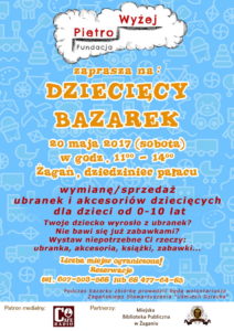 W imieniu Fundacji Piętro Wyżej oraz partnerów Miejskiej Biblioteki Publicznej - oddziału dziecięcego, Pałacu Książęcego sp. z o.o. i Radia Cafe 20 maja 2017 roku (w sobotę) serdecznie zapraszamy na DZIECIĘCY BAZAREK, czyli kiermasz rzeczy z drugiej ręki.W sobotę 20 maja w godzinach 11.00-14.00 przed pałacem wystawiamy niepotrzebne i nieużywane już rzeczy: ubranka, akcesoria, sprzęt, […]