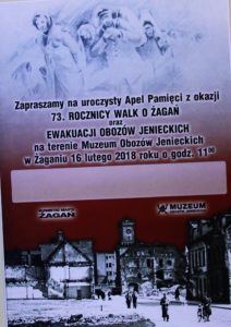 Burmistrz Miasta Żagań i Muzeum Obozów Jenieckich w Żaganiu zapraszają na uroczysty apel z okazji 73. rocznicy walk o miasto oraz ewakuacji obozów. Uroczystość odbędzie się na terenie Muzeum Obozów Jenieckich przy ul. Lotników Alianckich, w piątek 16 lutego o godz. 11.00.