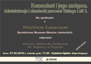 Miejska Biblioteka Publiczna im. Papuszy zaprasza we wtorek 27 lutego o godz. 17.00 do czytelni ogólnej na spotkanie z Markiem Łazarzem, dyrektorem Muzeum Obozów Jenieckich w Żaganiu. Tematem spotkania będzie "Komendant i jego zastępca. Administracja i niemiecki personel Stalagu Luft 3. Wstęp wolny.