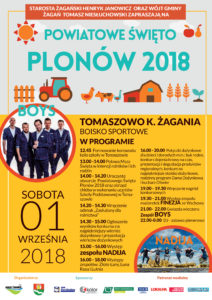 W sobotę 1 września w Tomaszowie koło Żagania odbędzie się powiatowe Święto Plonów. Początek - formowanie się korowodu koło szkoły, 13.00 msza polowa w intencji rolników, 14.00 uroczyste otwarcie imprezy, wręczenie odznaczeń, gry i zabawy, konkurs dożynkowy. O 21.00 gwiazda wieczoru, zespół Boys. Po koncercie zabawa plenerowa.