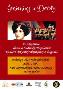 Serdecznie zapraszamy Państwa, a przede wszystkim żagańskie Doroty na "Imieniny u Doroty", które odbędą się 10 lutego 2019 roku (niedziela) o godz. 16:00 w sali Kryształowej Pałacu Książęcego.Podczas tego wyjątkowego przyjęcia w programie mnóstwo atrakcji m.in. Słowo o Ludwiku Napoleonie, historia, anegdoty w Salonie u Doroty, koncert Orkiestry Wojskowej z Żagania. Wstęp wolny.