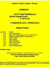 W imieniu organizatora - parafii św. Józefa w Żaganiu zapraszamy 8 września na XII Festyn Parafialny przy kościele Świętego Krzyża przy ulicy Szprotawskiej. Program Festynu: 12.00 Msza św. 13.00 Zespół CON ANIMA 13.30 występ dzieci z PSP Nr 3 im.Jana Pawła II 14.00 Młodzieżowa Sekcja Wokalna z Centrum Kultury 14.30 Zespół LUTNIA 15.00 Zespół AMIGO […]