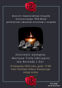8 listopada 2019 roku o godzinie 17.00 zapraszamy do Sali Familijnej Pałacu Książęcego na koncert Zespołu Artystycznego "Pod Różą" poświęcony zmarłym artystom z zespołu.