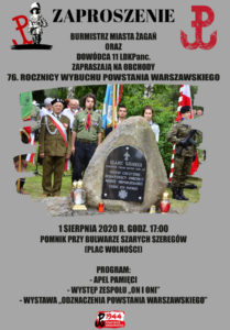 Zapraszamy do wzięcia udziału w uroczystościach upamiętniających 76. rocznicę wybuchu Powstania Warszawskiego, które odbędą się o godz. 17.00 na bulwarze Szarych Szeregów w Żaganiu. Przypominamy, że cały czas obowiązuje reżim sanitarny w zakresie zgromadzeń, zapraszamy zatem do udziału w uroczystościach w maseczkach.