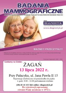 Zachęcamy wszystkie Panie w wieku 50-69 lat do wykonania bezpłatnych badań mammograficznych. Mammobus przyjedzie do Żagania 13 lipca 2022 roku. Badania będą prowadzone na parkingu przy pałacyku na ul. Jana Pawła II 15. Rejestracja pod numerem telefonu 68 41 41 411 lub online:  https://diagnostyk.pl/