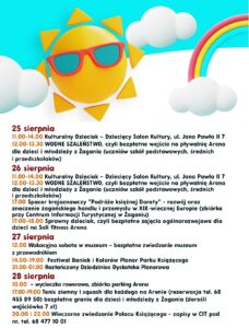 Sobota prezentuje się następująco 12.00 Wakacyjne soboty w muzeum – bezpłatne zwiedzanie muzeum z przewodnikiem 14.00-19.00 Festiwal Baniek i Kolorów Plener Parku Książęcego 21.00-01.00 Roztańczony Dziedziniec - Dyskoteka Plenerowa Ponadto: - Kąpielisko na Gryżycach zaprasza codziennie od 11.00 do 19.00 – wstęp bezpłatny! - W trakcie wakacji Orliki przy PSP 2 oraz przy PSP 3 […]