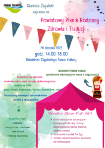 28 sierpnia (niedziela) zapraszamy Państwa na wyjątkowy Piknik Rodzinny pełen tradycji, zdrowia i EKO produktów. Starostwo Powiatowe zaprasza najmłodszych mieszkańców Powiatu Żagańskiego, na których czekać będzie MNÓSTWO atrakcji: - Wioska Slow Fun Art ,a w niej: strefa warsztatów sensoryczno-kreatywnych dla całej rodziny: sensoryczny mini plener malarski, roślinne stemple, farbowanie koszulek Tie dye, a oprócz tego […]