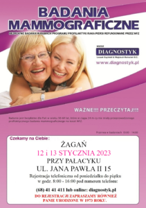 12 i 13 stycznia 2023 roku przy żagańskim pałacyku na ul. Jana Pawła II 15 przeprowadzane będą bezpłatne badania mammograficzne dla kobiet w wieku od 50 do 69 lat, które w ciągu ostatnich dwóch lat nie miały wykonywanych tego typu badań. Program skierowany jest do mieszkanek urodzonych w latach 1954-1973. Te Panie mogą już wykonać […]