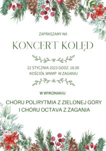 W niedzielę 22.01.2023 r. zapraszamy do udziału w pięknym wydarzeniu. Dwa lubuskie chóry - Polirytmia z Zielonej Góry i Octava z Żagania zaśpiewają dla Państwa najpiękniejsze kolędy. Występ odbędzie się w kościele WNMP o godzinie 18.00.