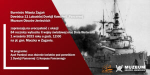 Burmistrz Miasta Żagań, Dowódca 11 Lubuskiej Kawalerii Pancernej i Muzeum Obozów Jenieckich w Żaganiu zapraszają na uroczystość z okazji 84 rocznicy wybuchu II wojny światowej oraz Dnia Weterana 1 września 2023 roku o godz. 12.00 na pl. gen. Maczka w Żaganiu. W programie apel pamięci oraz złożenie kwiatów pod pomnikiem 1 Dywizji Pancernej i 1 […]