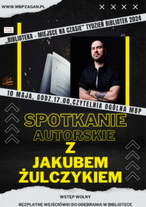 10 maja o 17:00 zapraszamy Państwa na spotkanie z Jakubem Żulczykiem, które odbędzie się w Miejskiej Bibliotece Publicznej w Żaganiu. Darmowe wejściówki do odebrania w Oddziale dla Dorosłych. Jakub Żulczyk ur. 1983 r. w Nidzicy, mieszka w Warszawie. Studia dziennikarskie i amerykanistyczne skończył w Krakowie, na UJ. W 2006 zadebiutował powieścią „Zrób mi jakąś krzywdę”, […]
