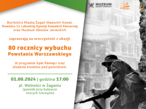 Burmistrz Miasta Żagań Sławomir Kowal, Muzeum Obozów Jenieckich oraz Dowódca 11 Lubuskiej Dywizji Kawalerii Pancernej zapraszają na uroczystość z okazji 80 rocznicy wybuchu Powstania Warszawskiego, która rozpocznie się 1 sierpnia 2024 roku o godz. 17:00 na pl. Wolności w Żaganiu (pomnik przy bulwarze Szarych Szeregów). W programie: - Apel Pamięci - złożenie kwiatów pod pomnikiem.