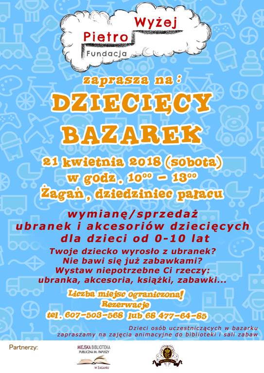 Fundacja Piętro Wyżej, spółka Pałac Książęcy oraz Miejska Biblioteka Publiczna serdecznie zapraszają w sobotę, 21 kwietnia, w godz. 10.00-13.00 przed żagański pałac, gdzie odbędzie się kiermasz rzeczy z drugiej ręki: ubranek, akcesoriów, sprzętu, książeczek, zabawek…