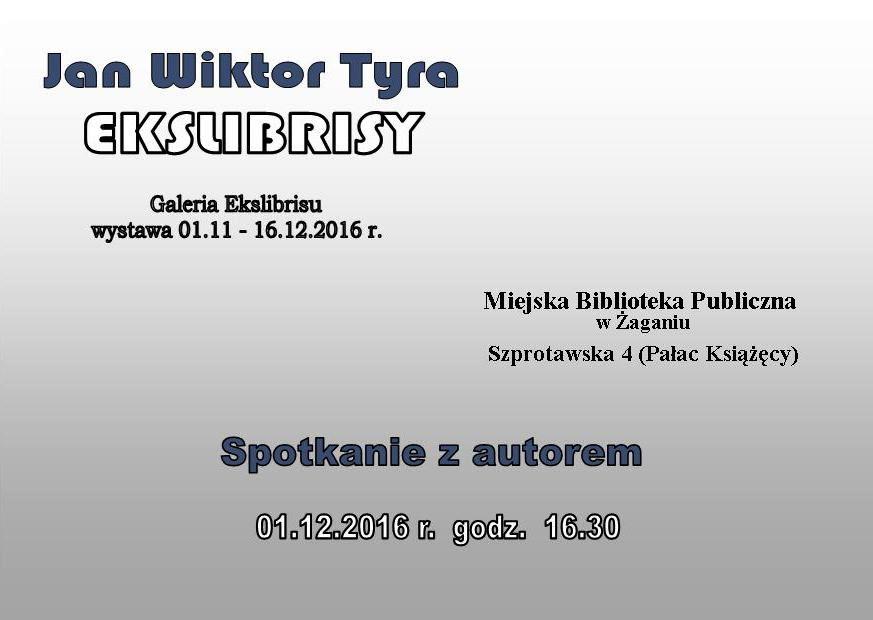 Miejska Biblioteka Publiczna w Żaganiu zaprasza na spotkani z autorem prezentowanych w Galerii Ekslibrisu grafik, Janem Wiktorem Tyrą z Żar. Spotkanie odbędzie się 1 grudnia o godzinie 16:30.
