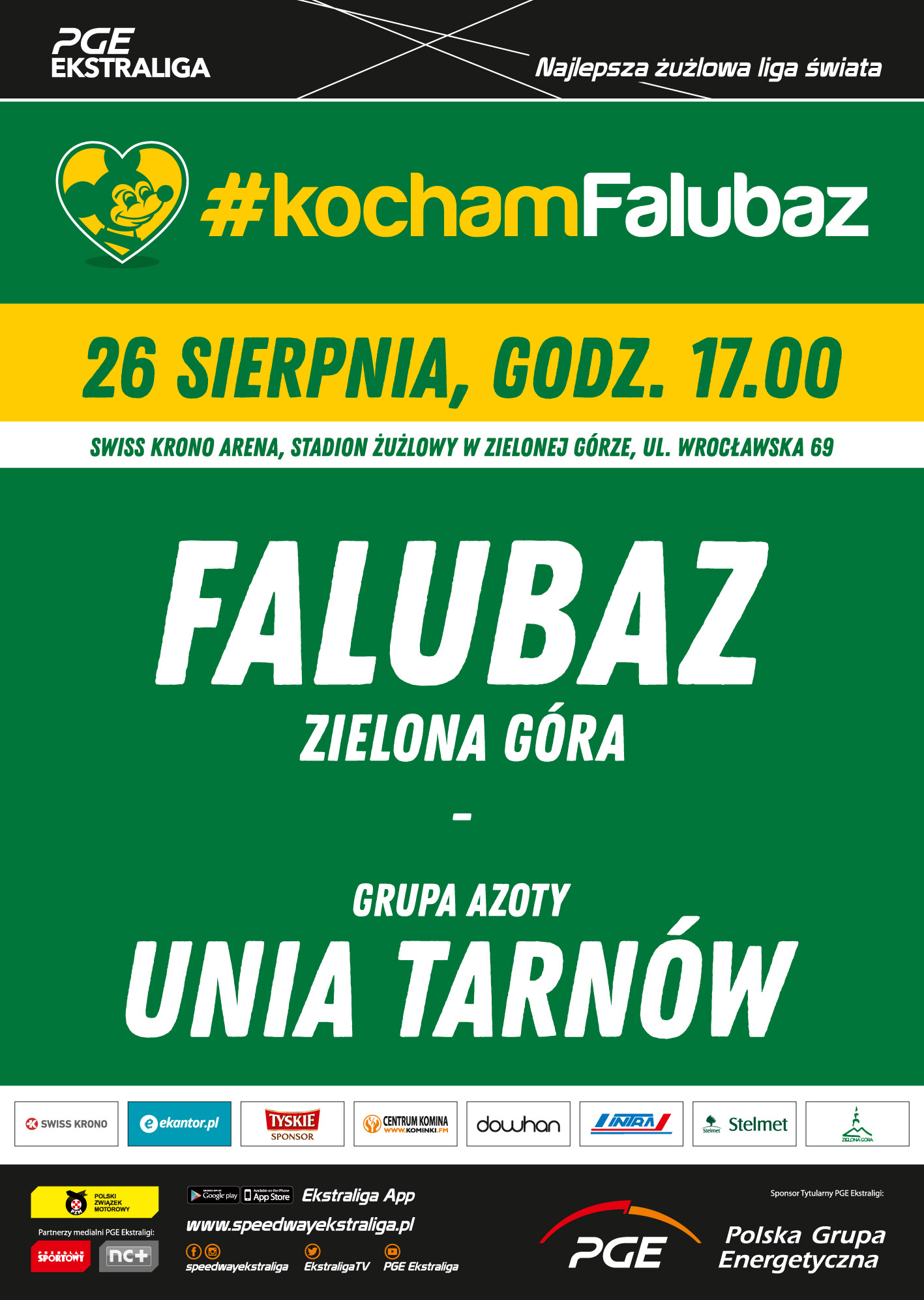 W niedzielę 26 sierpnia o godz. 17.00 zapraszamy na stadion żużlowy Falubazu przy ul. Wrocławskiej 69 w Zielonej Górze na mecz z Unią Tarnów Grupa Azoty.