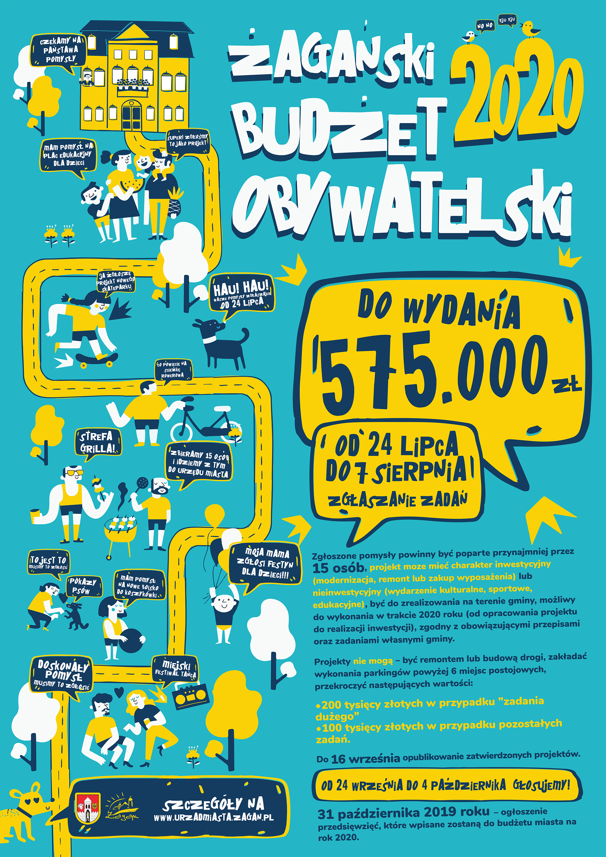 Zgodnie z harmonogramem Budżetu Obywatelskiego 2020 trwa głosowanie nad propozycjami zgłoszonymi na wcześniejszym etapie żagańskiego budżetu partycypacyjnego. W terminie od 24 września do 4 października 2019 roku głosują Państwo na jedno z zadań z listy, decydując w ten sposób o przeznaczeniu części budżetu publicznego na przedsięwzięcia zaproponowane przez mieszkańców.