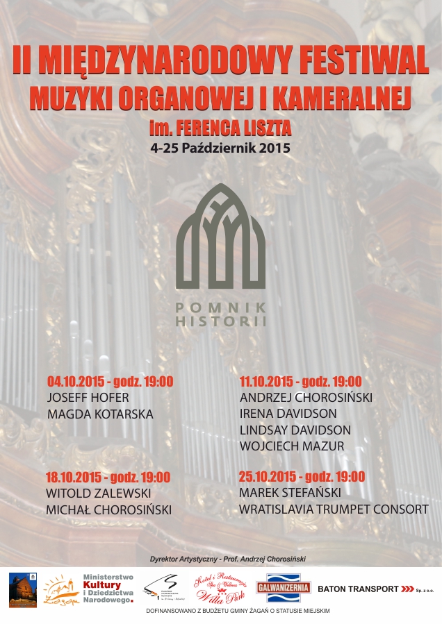 W imieniu organizatorów zapraszamy na II Międzynarodowy Festiwal Muzyki Organowej i Kameralnej im. Ferenca Liszta, który odbędzie się w Kościele Wniebowzięcia Najświętszej Marii Panny w Żaganiu przy Placu Klasztornym. Dyrektorem Artystycznym festiwalu jest profesor Andrzej Chorosiński.
