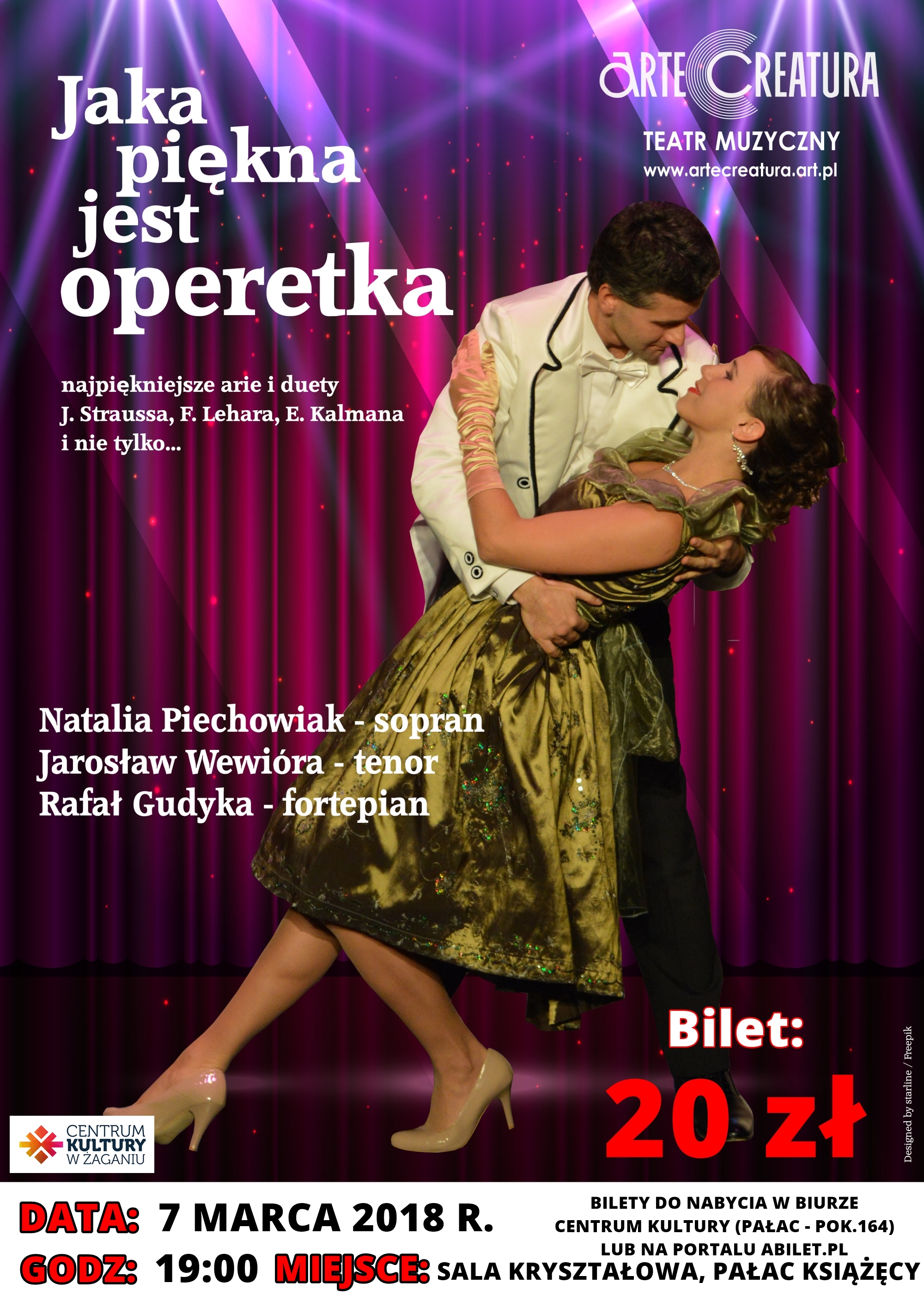 Zapraszamy wszystkich na wyjątkowy koncert operetkowy pt. „Jaka piękna jest operetka” w wykonaniu artystów z Teatru Muzycznego Arte Creatura, który odbędzie się 7 marca, godz. 19.00