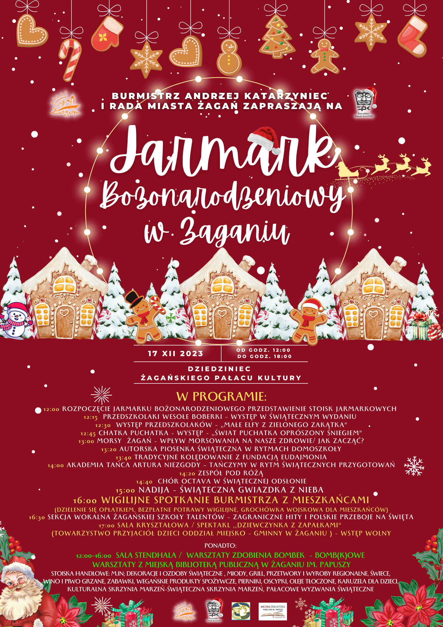 Zapraszamy 17 grudnia na dziedziniec Żagańskiego Pałacu Kultury na Jarmark Bożonarodzeniowy pełen straganów w pysznościami, gadżetami świątecznymi, upominkami. Zapraszamy do wysłuchania występów i wspólnego kolędowania. O godzinie 16.00 rozpocznie się Wigilia Miejska, składanie życzeń, dzielenie się opłatkiem.