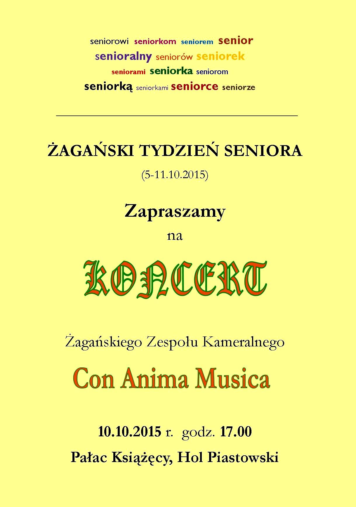 W ramach tegorocznych obchodów Żagańskiego Tygodnia Seniora zapraszamy Państwa na występ zespołu Con Anima Musica. Zespół wystąpi w sobotę (10 października) w Holu Piastowskim Pałacu Książęcego w Żaganiu. Rozpoczęcie koncertu nastąpi o godzinie 17:00.