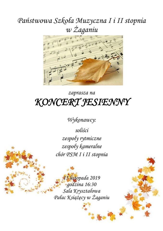 Państwowa Szkoła Muzyczna I i II stopnia w Żaganiu zaprasza na “Koncert jesienny”, w którym wychowankowie placówki zaprezentują swoje umiejętności na Sali Kryształowej Pałacu Książęcego. Zaczynamy o godzinie 16.30.