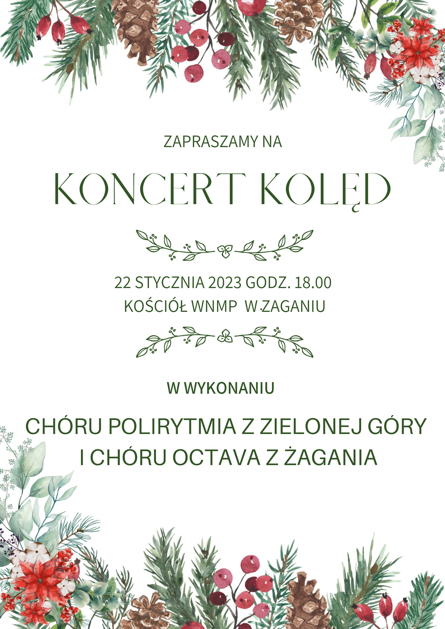 W niedzielę 22.01.2023 r. zapraszamy do udziału w pięknym wydarzeniu. Dwa lubuskie chóry – Polirytmia z Zielonej Góry i Octava z Żagania zaśpiewają dla Państwa najpiękniejsze kolędy. Występ odbędzie się w kościele WNMP o godzinie 18.00.