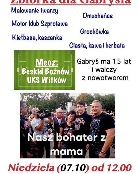 W niedzielę 7 października o godz. 12.00 na boisku w Bożnowie odbędzie się mecz charytatywny na rzecz 15-letniego Gabrysia z Żagania, walczącego z chorobą nowotworową. W programie imprezy mecz Beskid Bożnów kontra UKS Witków, malowanie twarzy, motor klub Szprotawa, grochówka, ciasta, kawa. Zebrane pieniądze zostaną przeznaczone na leczenie chłopca.