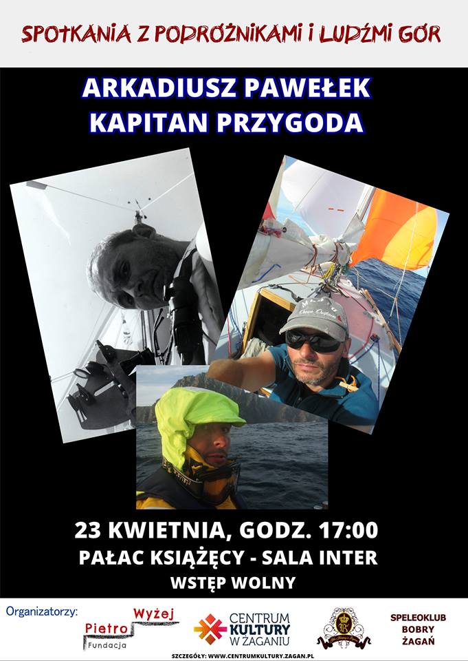 Zapraszamy na kolejne Spotkanie z Podróżnikami i Ludźmi Gór. W niedzielę 23 kwietnia w Pałacu Książęcym w Sali Inter o godzinie 17.00 wyruszymy w podróż przez morza i oceany. Na wodzie – ARKADIUSZ PAWEŁEK, który m.in. jako drugi człowiek na świecie samotnie przepłynął pontonem “Cena strachu” przez Atlantyk, członek załogi słynnej “Łódki Bols”.